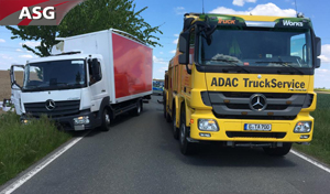 Der Mercedes-Benz Atego kam von der Fahrbahn ab, streifte mehrere Bäume bevor er seitlich an einen Baum lehnend zum stehen kam. Der Kofferaufbau wurde dabei massiv beschädigt.